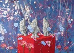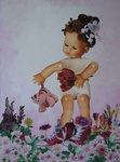 2014Oosters meisje met op haar arm een pimpelmeesje. In haar hand een theekopje met bloesem en een bij.