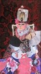 2014Een dame met een hoofddeksel van takjes is hiet geportretteerd. Ze heeft eetstokjes in haar hand waarop een spreeuw balanceerd.